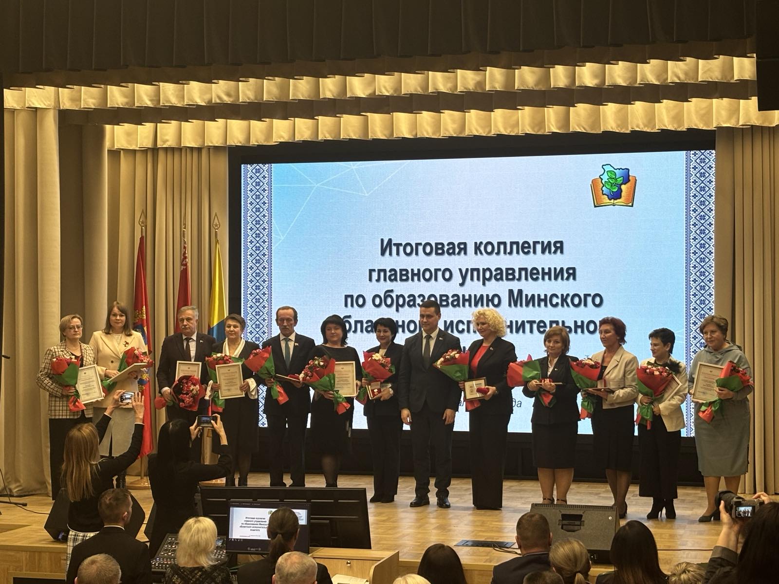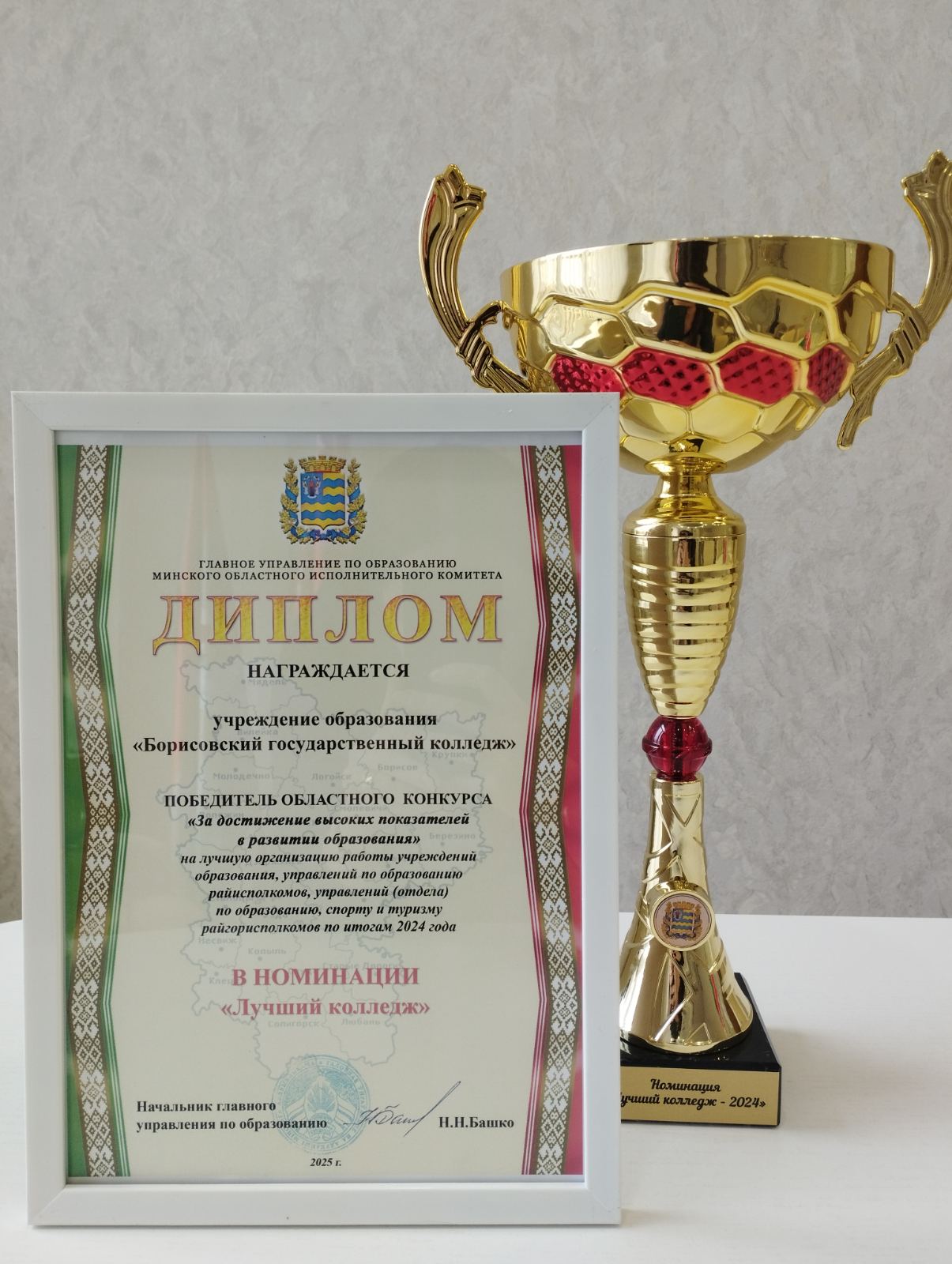 Начальник главного управления по образованию Минского облисполкома Николай Николаевич Башко и председатель Минской областной организации Белорусского профсоюза работников образования и науки Татьяна Валентиновна Апранич по итогам 2024 года наградили лауреатов и победителей областного конкурса «За достижение высоких показателей в развитии образования» в различных номинациях. Борисовский государственный колледж награждён дипломом Победителя в номинации "Лучший колледж".
